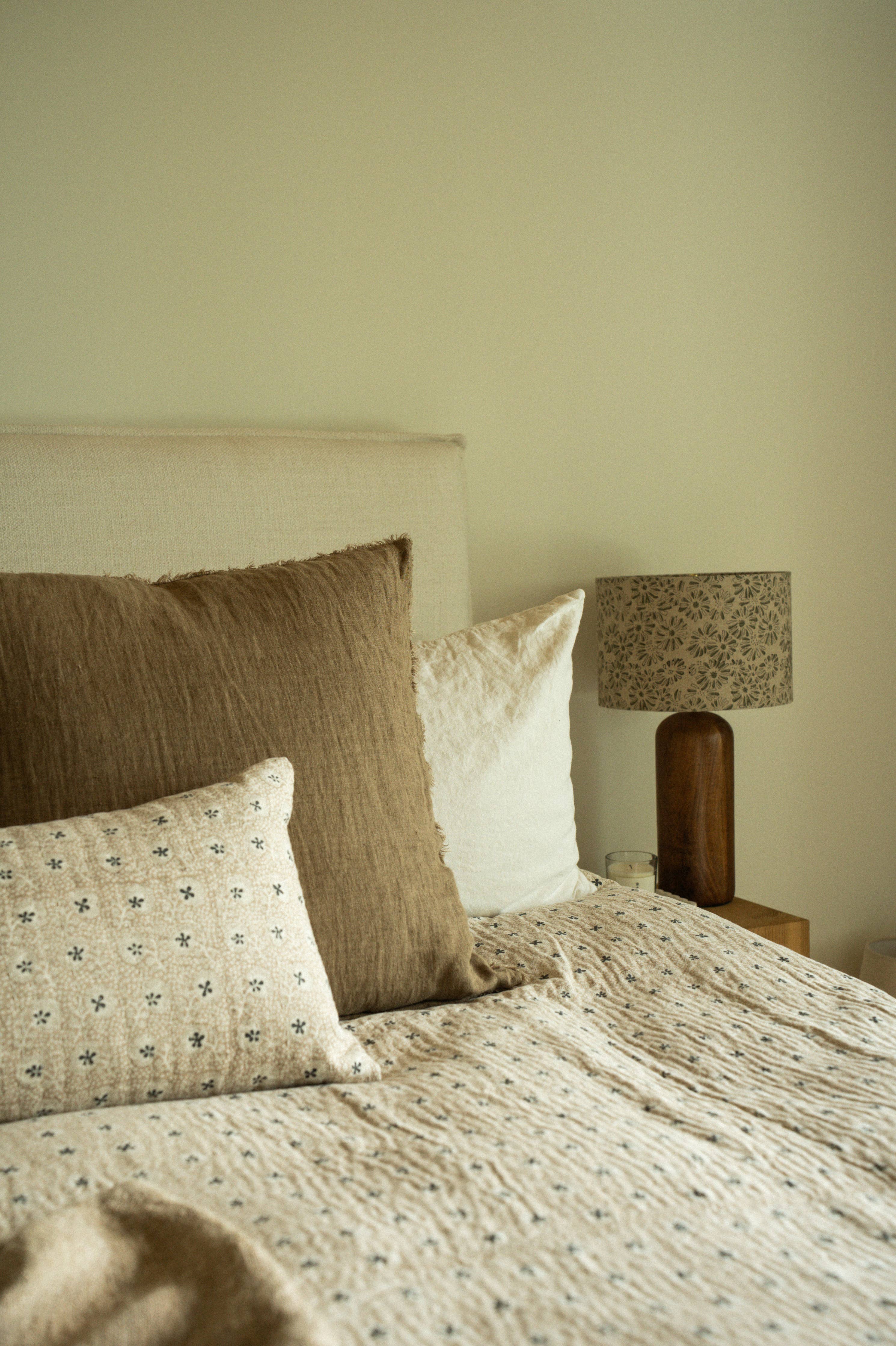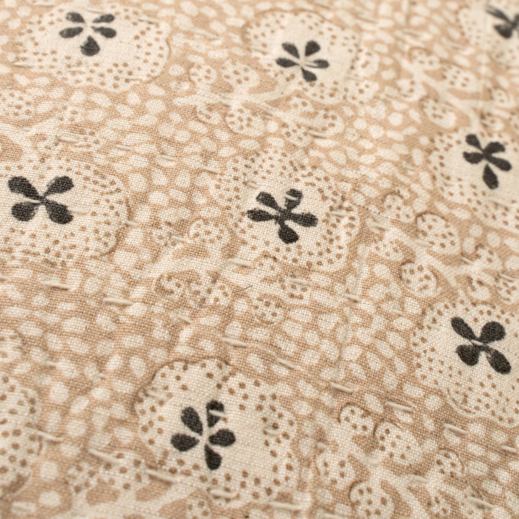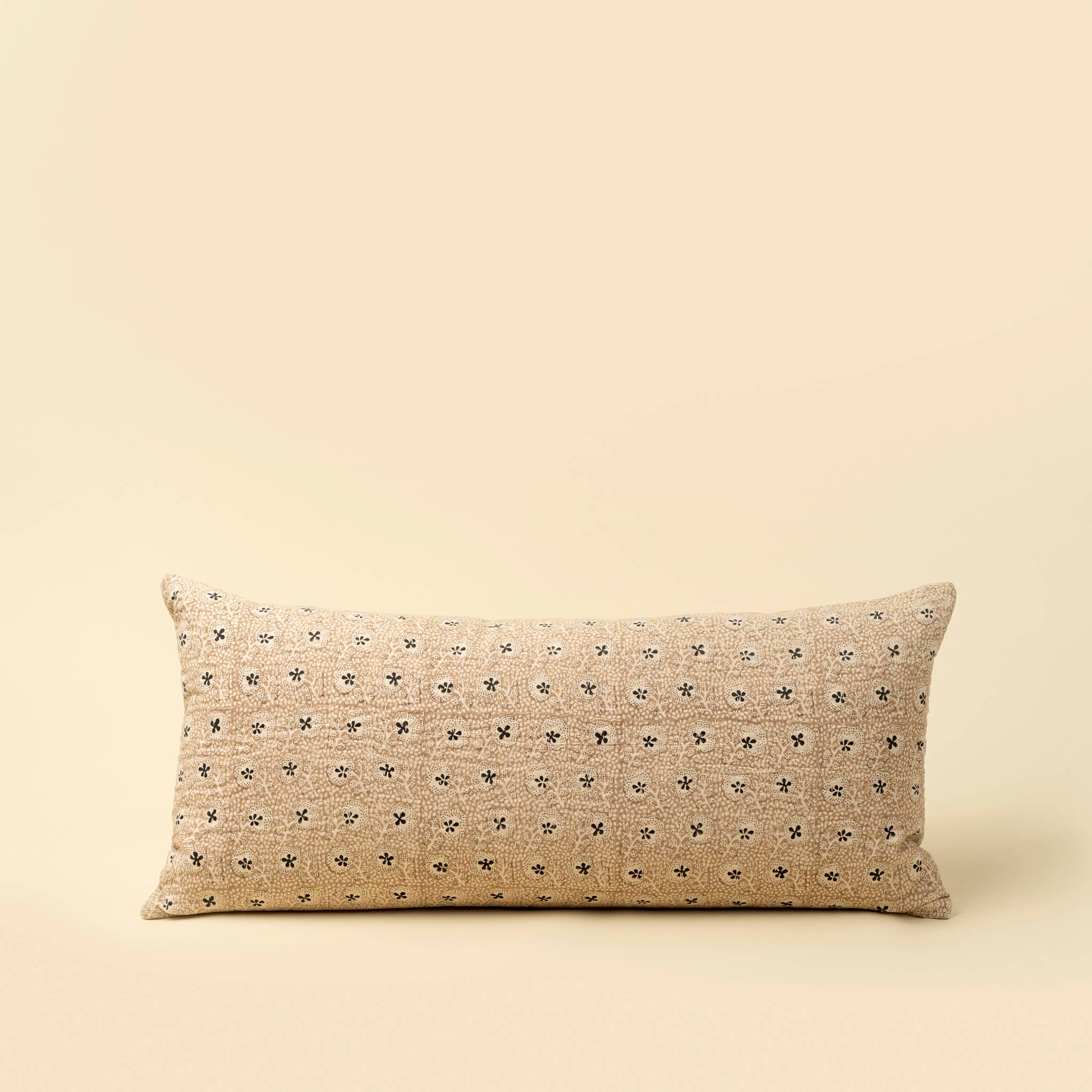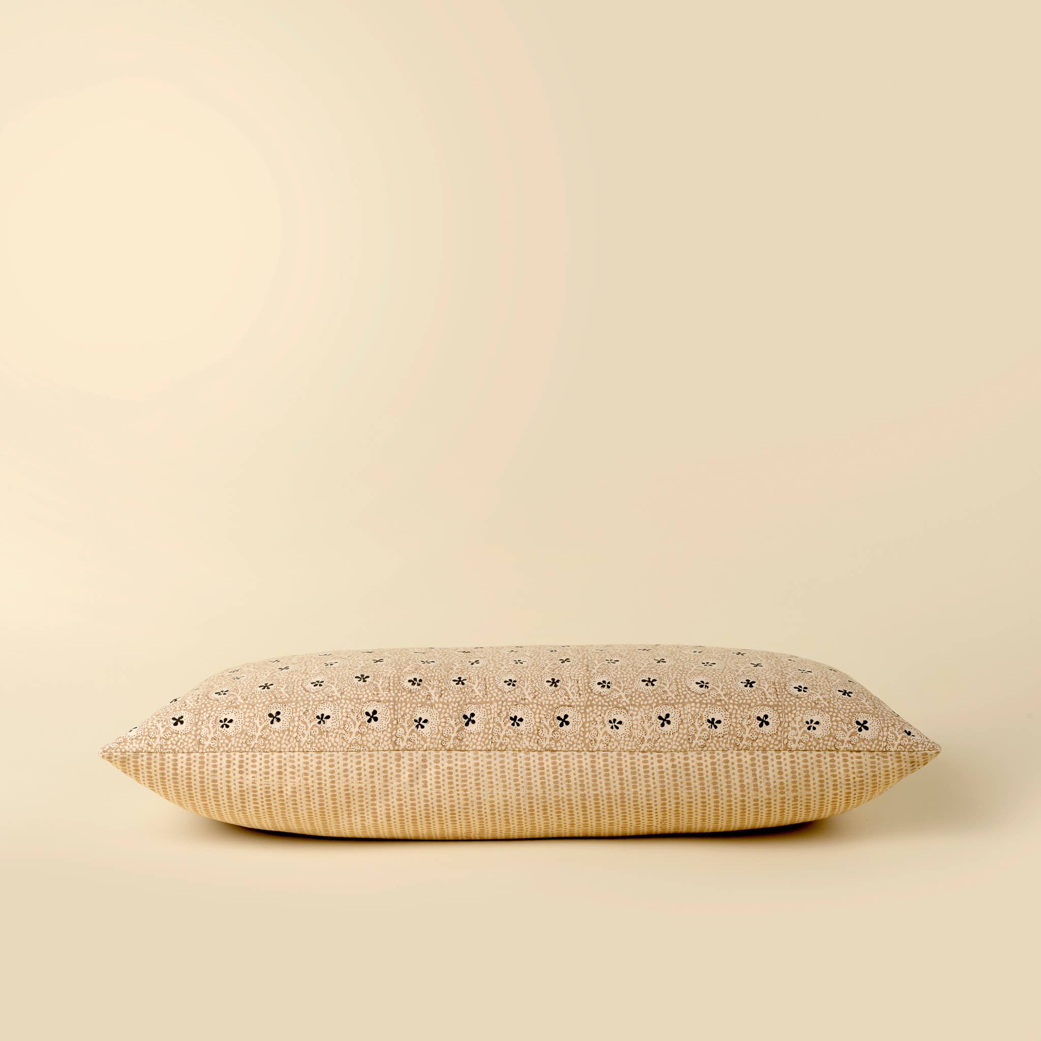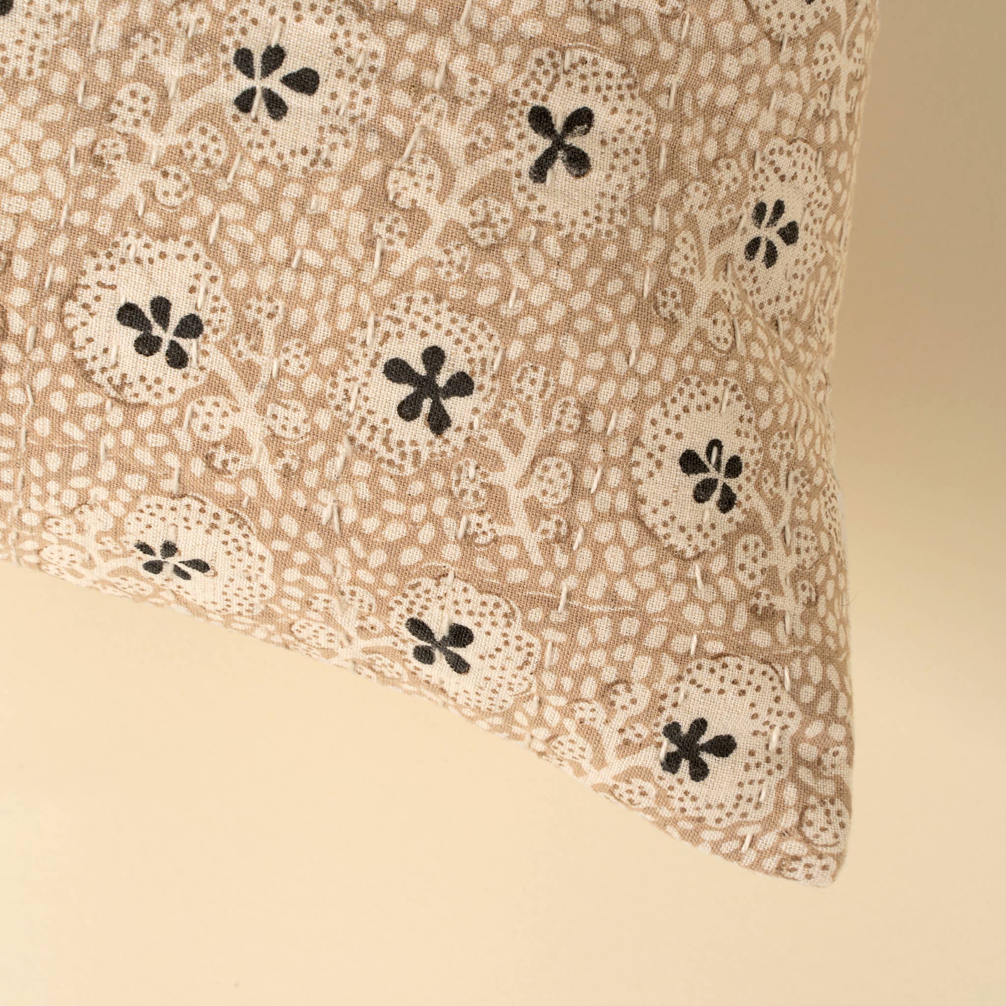 The Clover Block Print Kantha Pillow blends subtle pattern with soulful craftsmanship. Featuring a neutral cotton base adorned with a delicate handcrafted block print and finished with kantha stitching, it's a timeless decor pillow that celebrates slow, considered design.