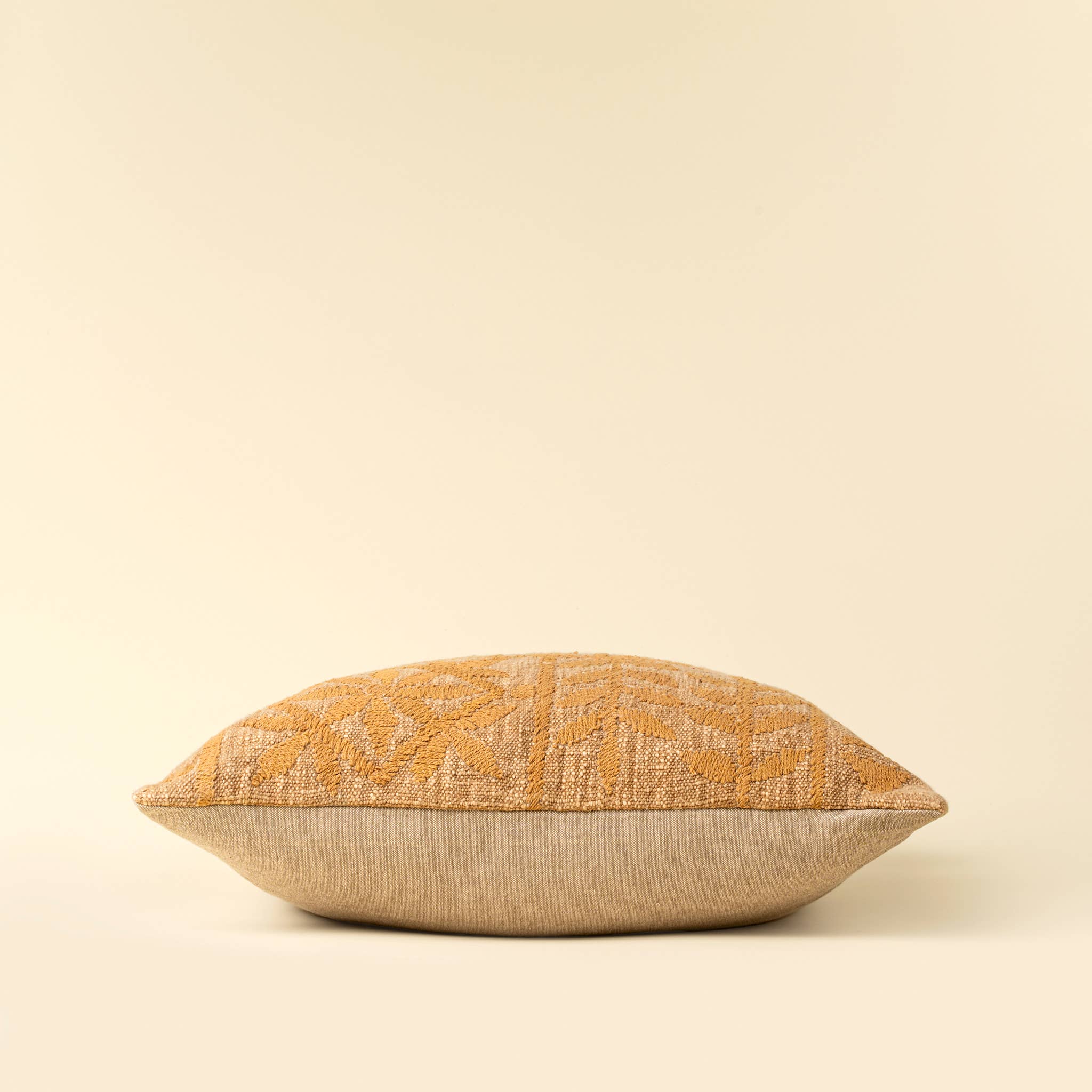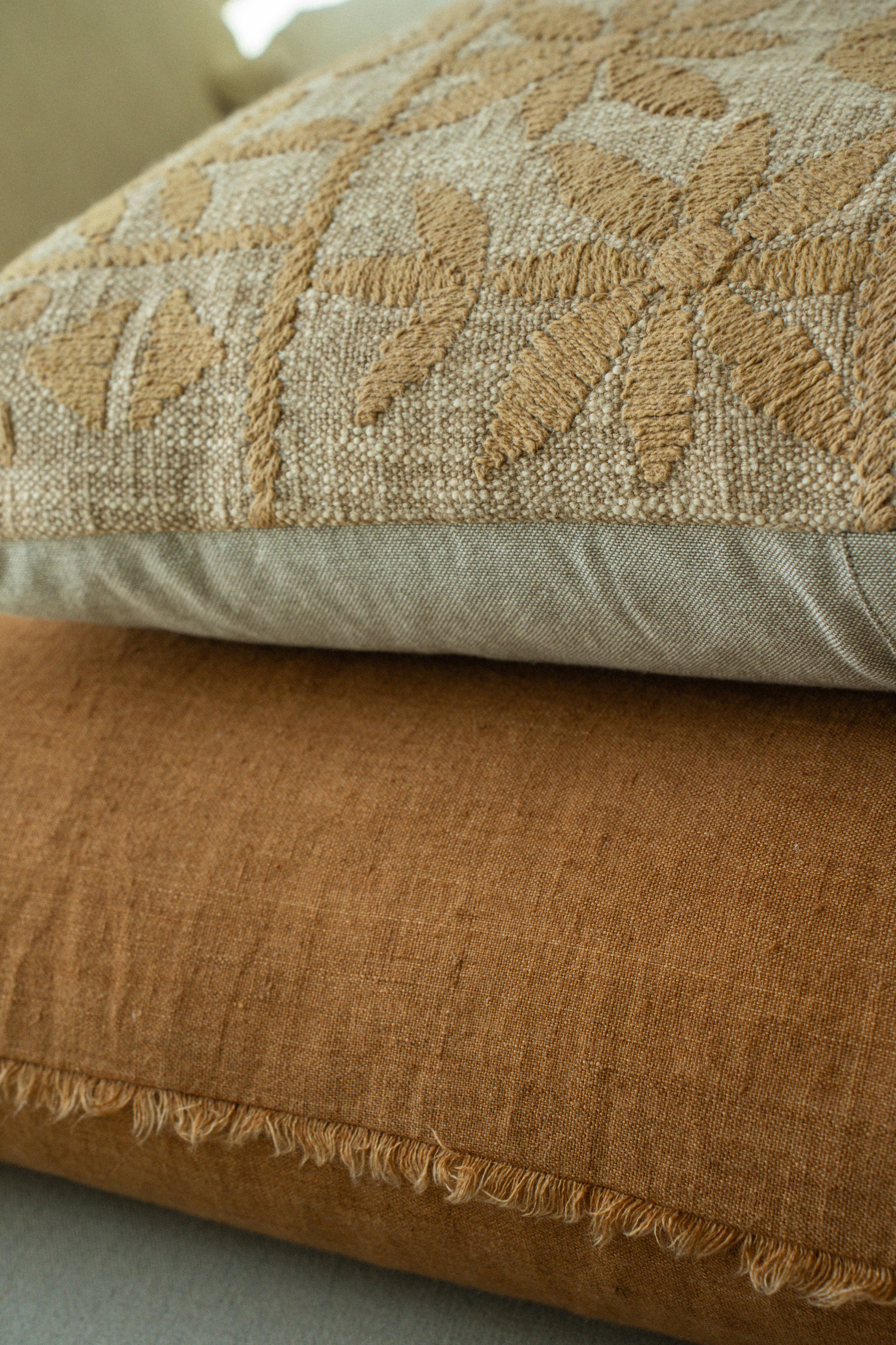 Bring warmth and subtle detail to your space with the Isolde Embroidered Pillow, a handcrafted accent pillow made for layering. Made with a stonewashed slub texture, it features tone-on-tone embroidery in a soft tiled floral motif that adds dimension to interior styling. The earthy, warm tones make it easy to style with other decorative toss pillows, while its rich texture and understated pattern bring quiet charm to any bed, bench, or sofa.
