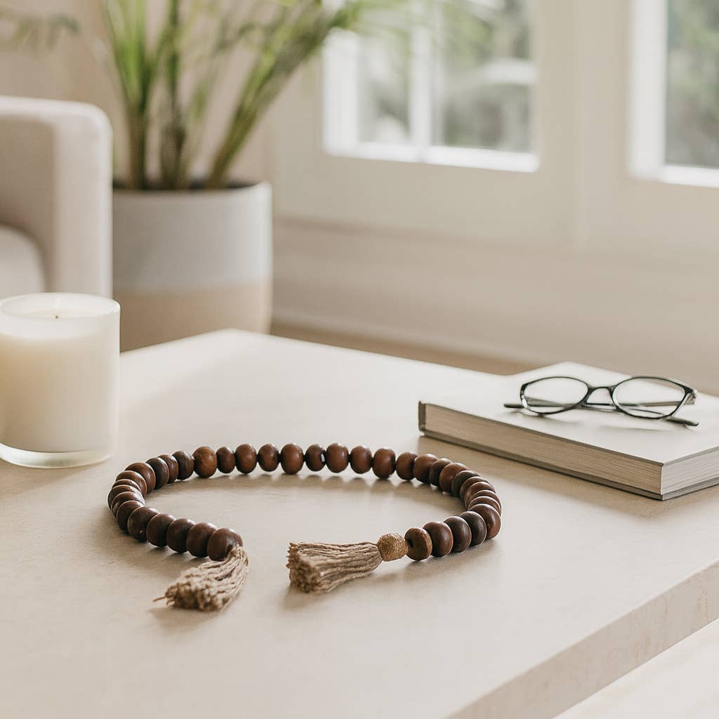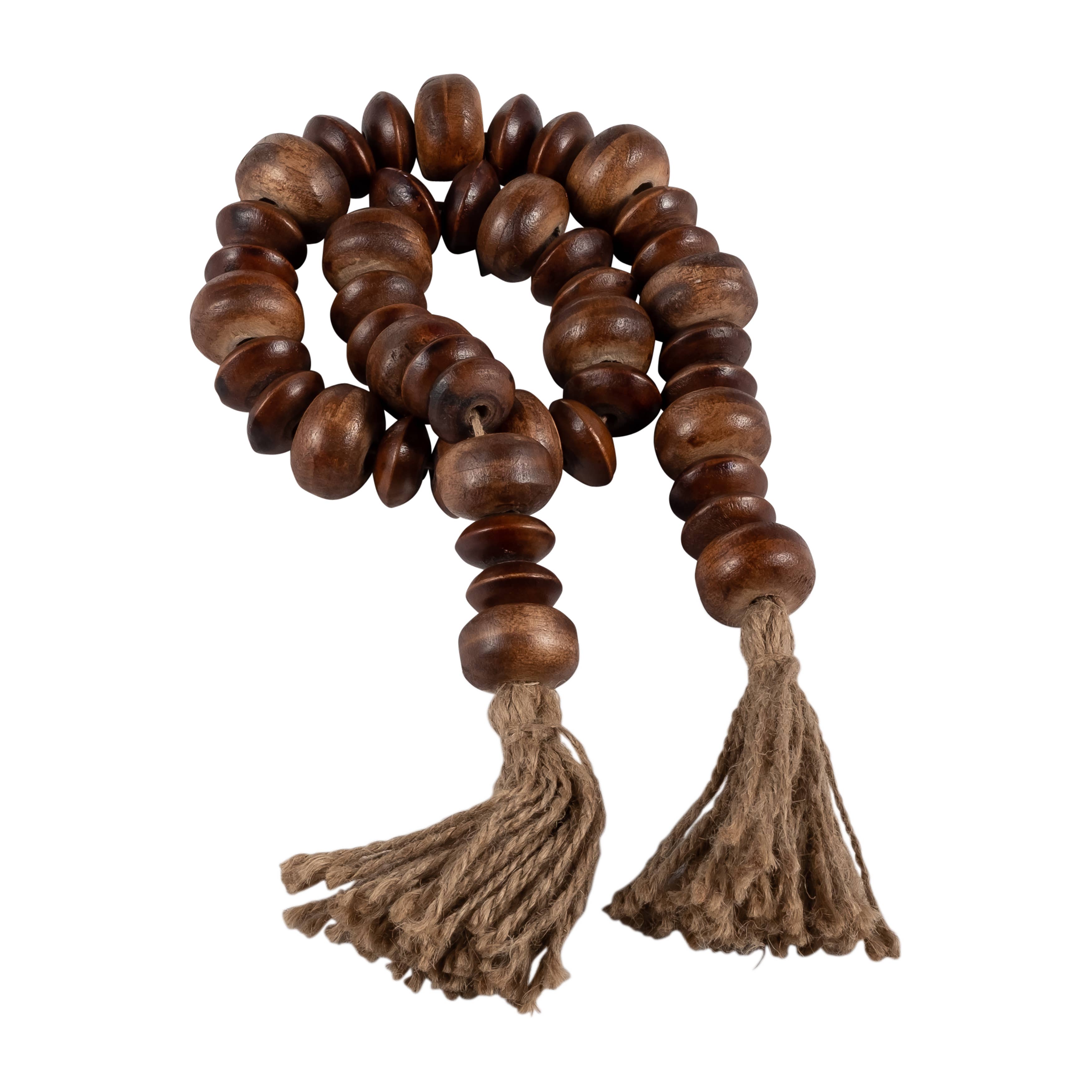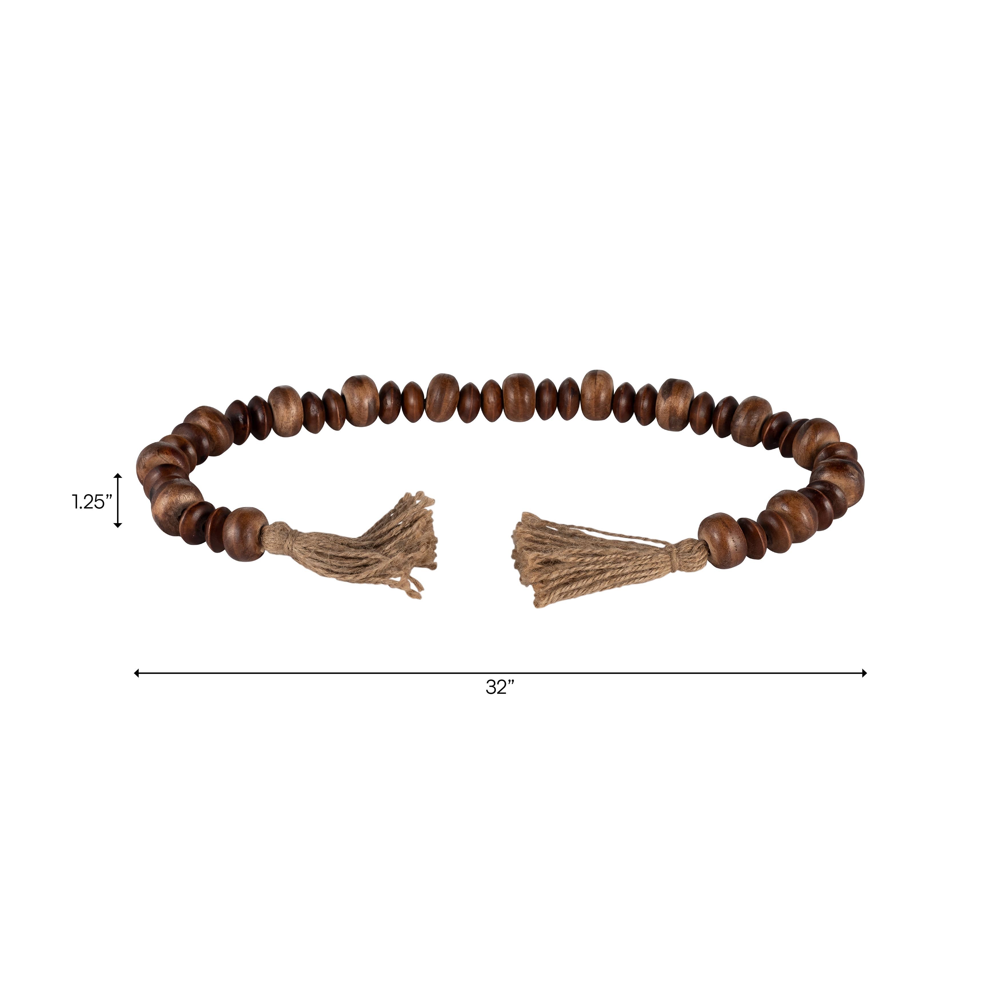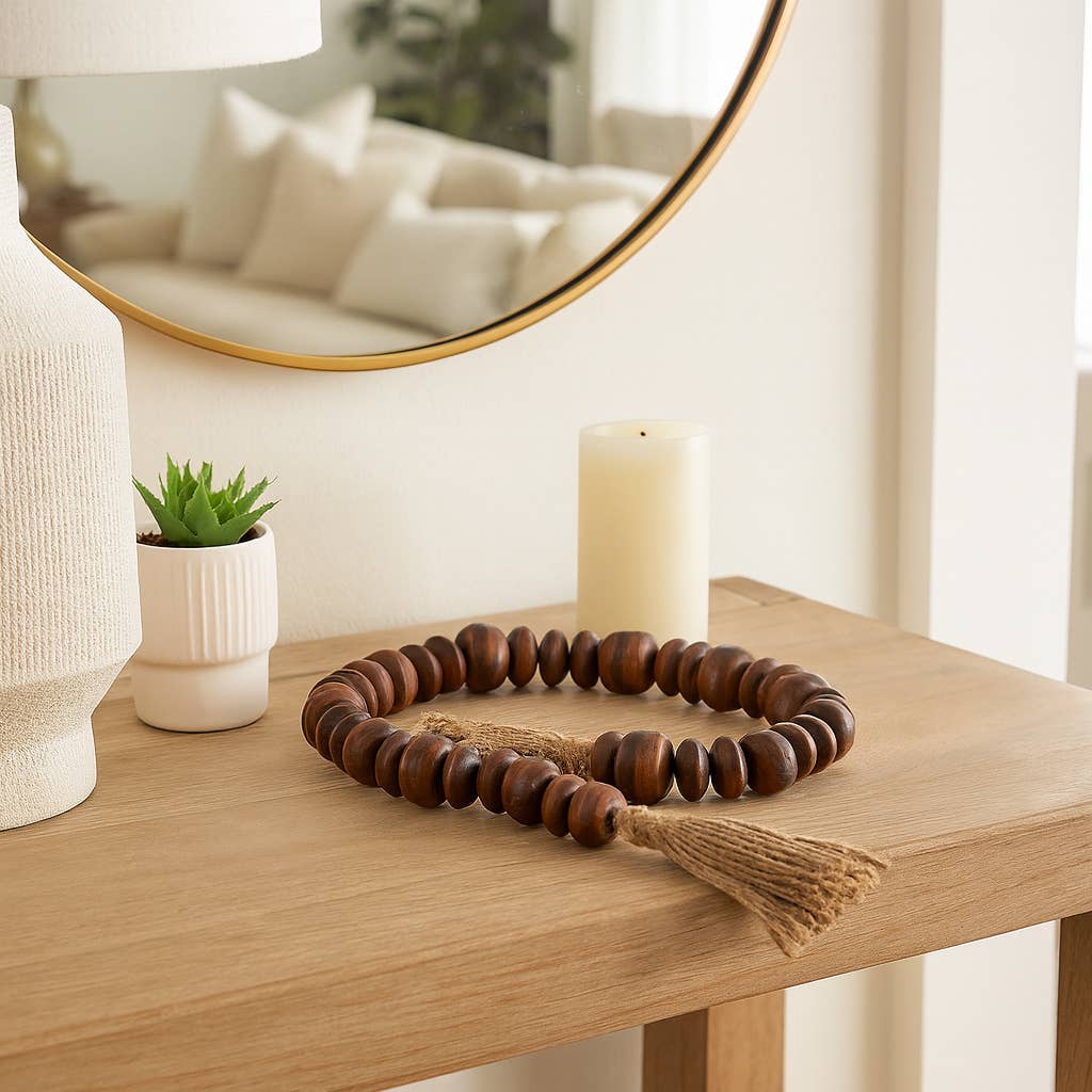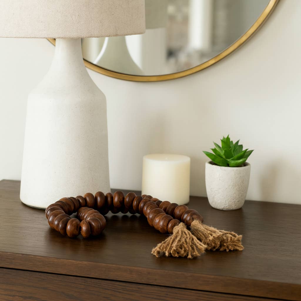 Crafted from natural wood beads with jute tassels, this versatile accent enhances coffee table decor or shelf decor, adding rustic warmth to modern homes. Compact and versatile, this strand complements vases, trays, or mantels as decorative accent pieces, blending seamlessly with rustic or farmhouse decor.