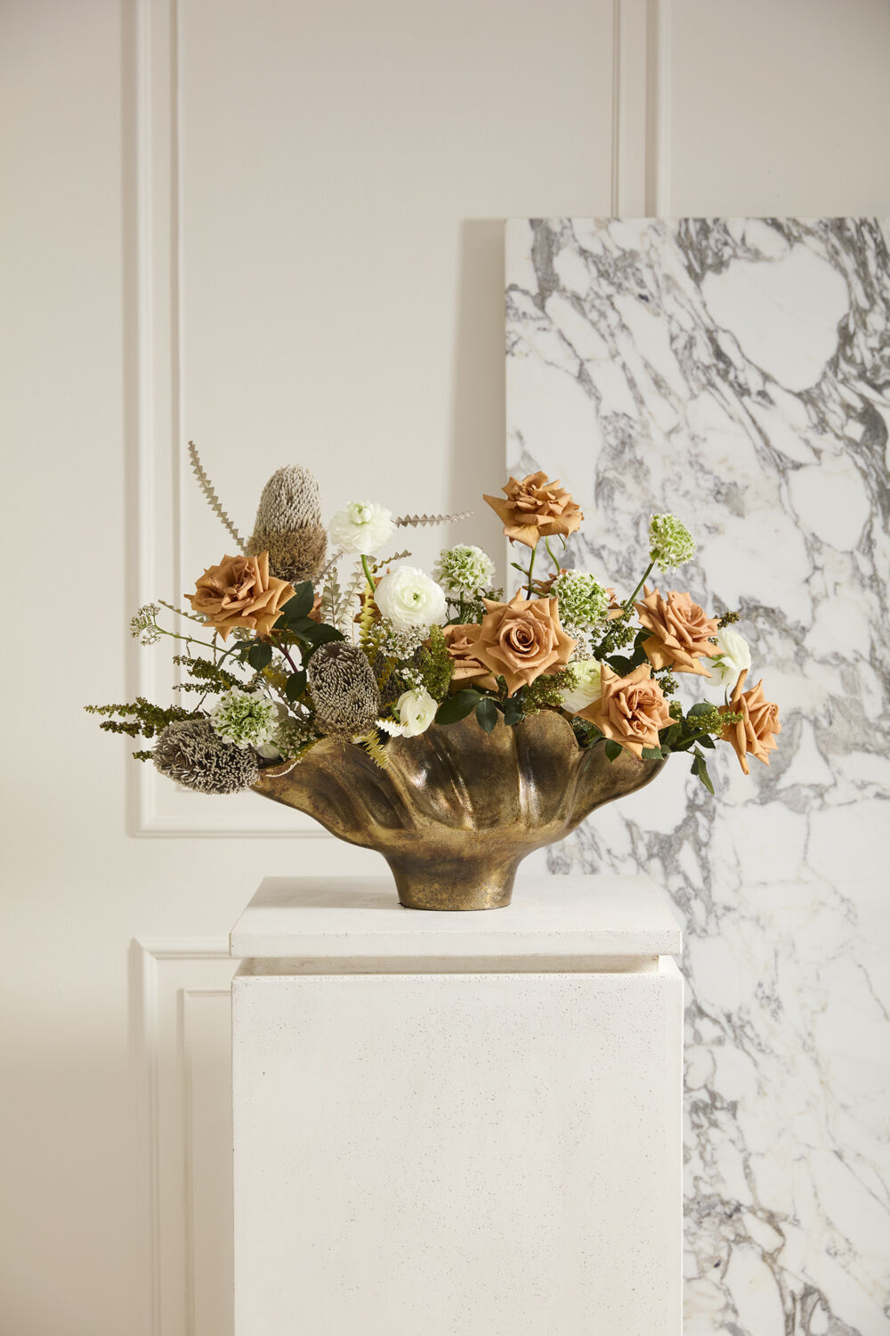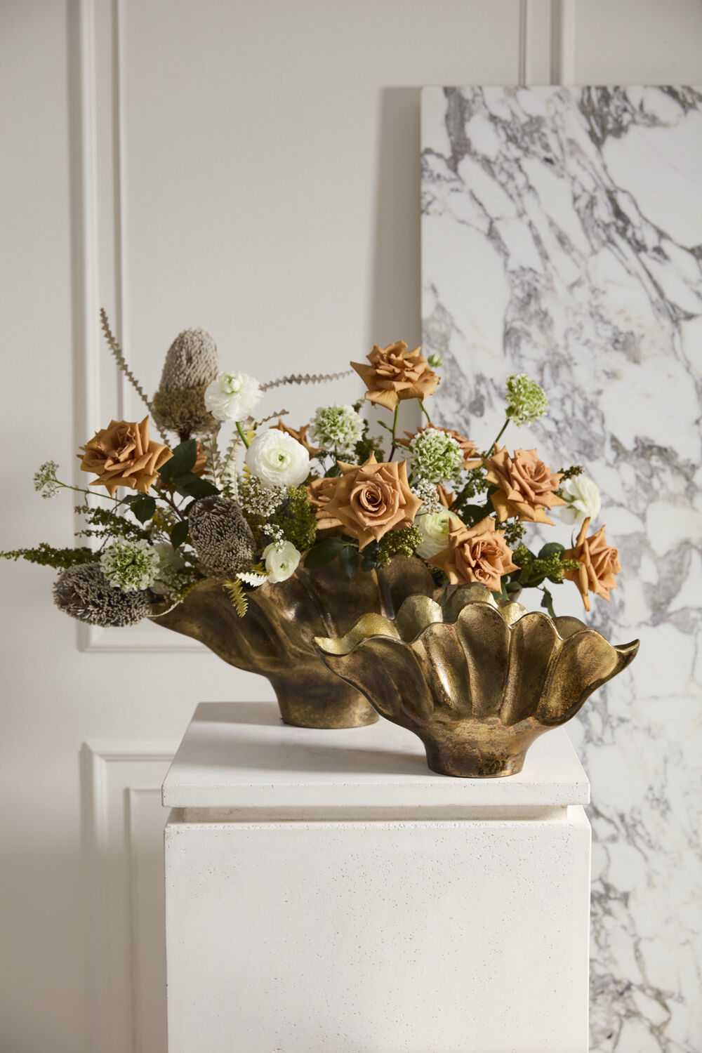 Artfully crafted to have an organic, undulating shape, the Nix Boat is a stunning vessel for bold florals, or can stand as a decorative piece on its own. Molded from recycled cast aluminum and finished in a warm, antique gold hue, the Nix has an old world feel combined with lots of function. The sturdy base keeps a large arrangement in place and the roomy interior can accommodate any type of floral mechanics.