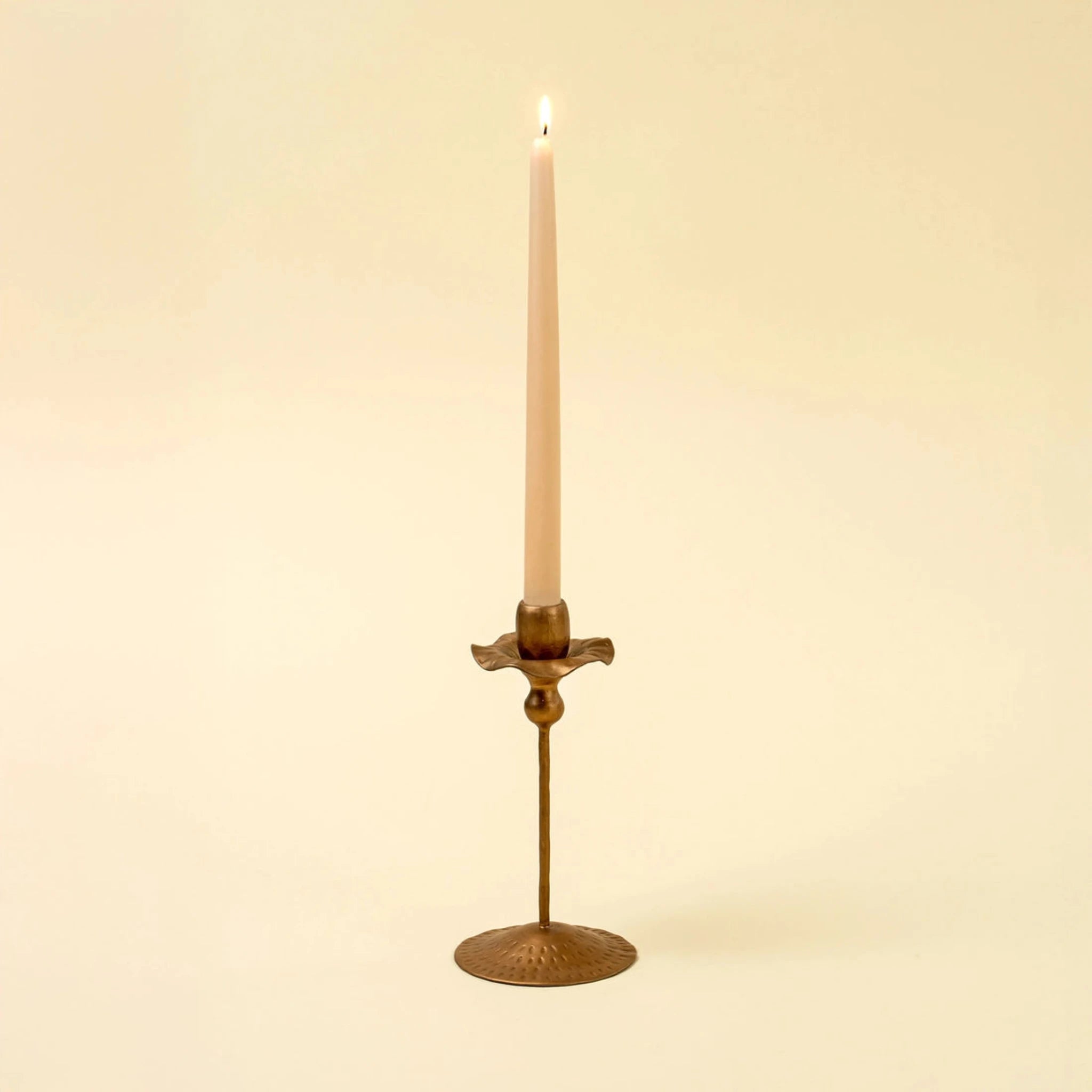 A Handcrafted Accent Decor Piece with Floral Detail Elevate your table or mantel with the Tulip Candlestick, a handcrafted piece that blends traditional crafting methods with sculptural style. Made from 100% iron and finished with a warm patina, this candlestick features a floral-inspired form with delicately carved details. Its tulip-like shape and subtle texture bring soft elegance to any accent decor arrangement.