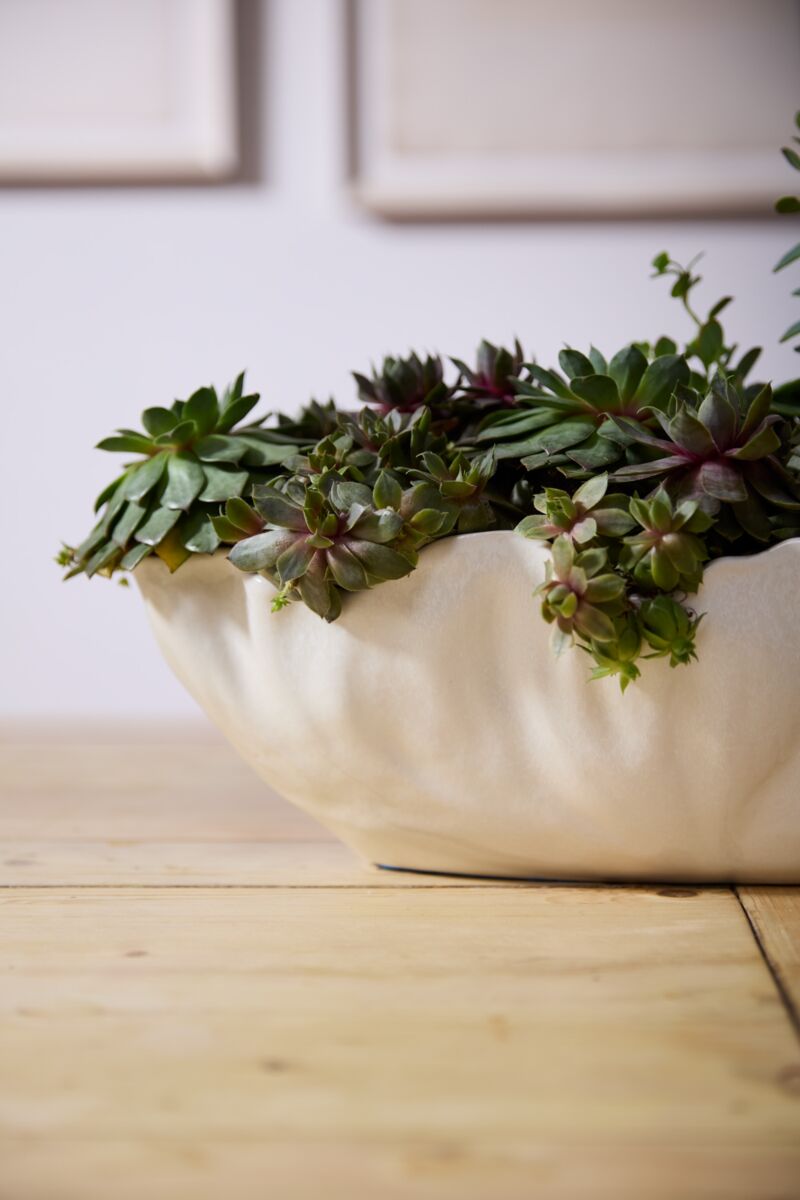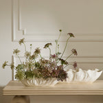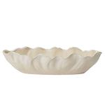 Celebrate artisanal style with the elongated wide ceramic Coastline Trough. Featuring an organic ruffled rim & a warm white reactive glaze that provides variation in the finish, this piece makes a lovely long centerpiece for floral arrangments, orchids, other blooming plants. The dimensions allow for any type of floral mechanics. This home decorative accent piece is a lovely display for a console, coffee table, or dining table.