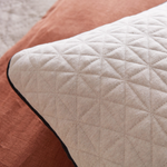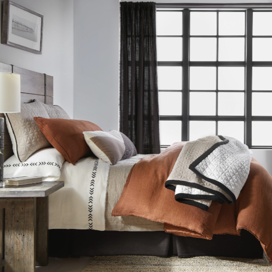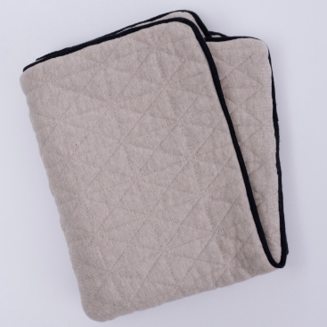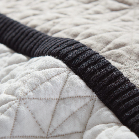 A knit quilt that reverses from heathered wheat on one side to a soft ivory on the other, with modern contrast stitching. The quilt is bound with asphalt for a dramatic edge.
